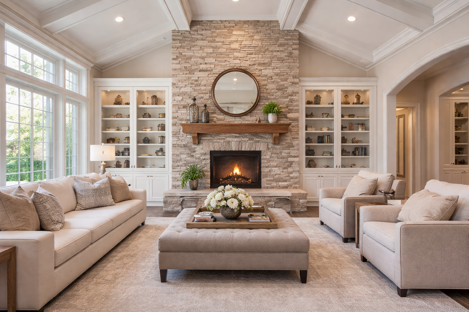 This custom great room features expertly crafted built-in cabinetry designed to frame a stunning stone fireplace. Precision joinery, premium materials, and refined finishes create a timeless focal point that blends beauty, function, and enduring craftsmanship.